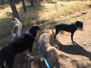 Griff and Dylan explored the trail at Shanahan Ridge, mostly independently of each other, while Roger Roger and Sputnik were on leash with me. Every now and then, they all found a spot they wanted to sniff together. At one point, Griff sniffed a particular area for a long time. Dylan went over to check it out, and immediately shouldered down and started wiggling in the grass. I hurried over and called Dylan to get back up, expecting that they had found some animal scat or a small carcass. Thankfully, whatever they found, that smelled so compelling, made no visible mess. Later on, Sputnik and Roger Roger went around shoulder-to-shoulder as they sniffed all the same spots while they were off leash together.