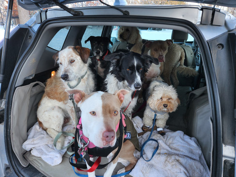 Griff, Zoey, Carl, Rey, Lou, Dylan and Ruffers headed to the Bear Creek Greenway for a big pack walk this afternoon. Carl was sporting a new jacket and boots. Lou had a fleece. The rest of the pack just had their natural coats. The pack made a few stops to sniff around in the snow, but everyone mostly stayed in formation as we kept on the move.
