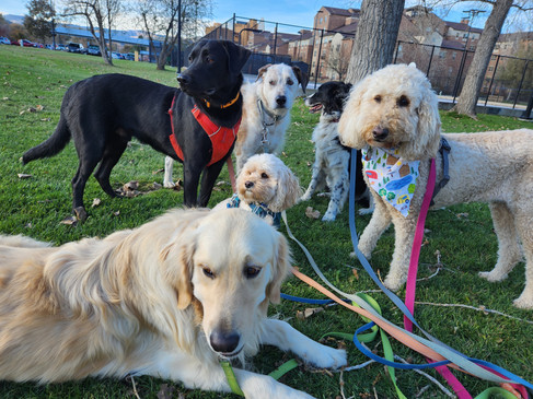 Yoshi, Lumi, Carl, Griff, Ruffers and Zoey headed to Martin Park this afternoon to walk Bear Creek Greenway. Yoshi continued to pull ahead a bit throughout most of the walk. Carl pulled a little here and there as well, but mostly walked nicely in position along with the rest of the pack. Aside from Ruffers starting to creep up to Zoey with a look in her eye like she was going to try to mount her after we stopped for a photo, the dogs were pretty mellow through the afternoon; our young boys Lumi and Yoshi didn't even get each other worked up.