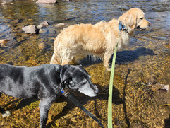 Ruffers, Lumi, Carl, Dylan, and Alfie strolled Boulder Creek Path this afternoon. We made a couple stops at the water along the way. Ruffers decided to remain dry. Carl and Alfie stuck with Ruffers on the rocks during our first water break, but decided to join Dylan and Lumi in the creek the second time. Those two, of course, made the most of both stops, and got some good soaks in. Carl and Ruffers were in the same biorhythm, and stopped in unison to squat and do their business about two-thirds of the way through the walk. Alfie jumped a couple times at a goose as we passed near it. The goose was taking its time walking away from the path and down to the creek, and didn't react to Alfie's antics. The rest of the pack were content to leave the goose in peace.