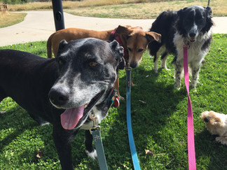 This afternoon, Dylan stayed upright while Carl and Mamacita both rolled around in the grass at the field where Zoey and Ruffers know we always stop, and therefore always pull toward as we approach. Lou climbed into my lap as I knelt down to take photos of the pack and give Dylan scritches while he stood next to me. Everyone did a great job of staying together and in position as we walked the Bear Creek Greenway.
