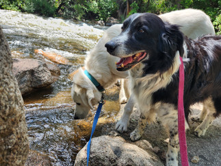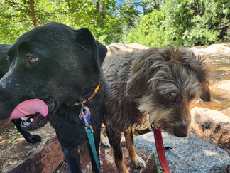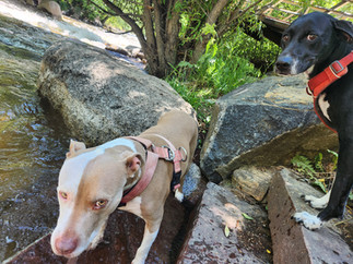 Yoshi and Archie eagerly splashed into Boulder Creek at Eben G. Fine Park. Lou also hurried down to the water, but stopped on the step that was only covered by a few millimeters. Nelly hung back and sniffed curiously over the creek. We made another stop further down the creek, where there was a more gradual bank and a large swath of calmer, shallow water. Lou ventured out and lay down in the water there, and Nelly poked around at the water's edge, getting her front paws wet. Yoshi and Archie got some practice walking calmly at my side and paying attention to our pace, which I kept very leisurely as we strolled the well-shaded footpath.