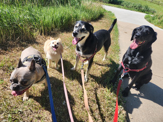 Eben G. Fine Park was full of people this afternoon. Carl was okay with skipping the usual sniff treatment of one of the trees that Zoey taught him to stop at, because there were too many people by it. When we got to the water, Lumi was the only one interested in getting a full soak in the creek. Alfie and Carl got their paws wet, and Ruffers preferred to stay fully dry. Carl wet his belly during our next water stop, while the others maintained their routines. The pack was in sync and well-mannered throughout the walk, eliciting comments from several passers-by that they were impressed.