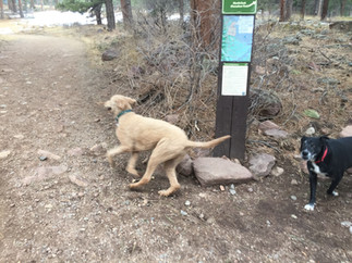 Milo and Dylan had a fun time together at Shanahan Ridge this morning. At first, they each wandered around separately, doing their own things; but a little way into the hike, they started going for little runs with each other. We encountered dogs hiking on leash with their humans a few times, and the boys came back promptly whenever I called them.