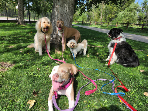 Zoey, Rey, Lou, Carl and Ruffers headed to the Bear Creek Greenway for this afternoon's pack walk. There were a few trains of bicyclists out on the path, including a parent followed by 1-3 children. One mom said her kids wanted to know if all the dogs were mine. It is a question I get asked pretty regularly. I let her know they're not my own, as they whisked by with friendly smiles. I looked down at the pack to see another bunch of friendly smiles. The pack hung out in the shade by the basketball courts after everyone spent a while sniffing around the base of the tree providing the shade.