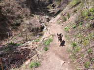 Archie and Bear bounded ahead, trying to outrace each other to the stream in the beginning stretch of Royal Arch. When Ruffers, Dylan, and I caught up to them, Dylan showed the others how to really make the most of a good stream by lying down and letting the water rush around him. Ruffers, on the other hand, delicately hopped over the stream, making sure not to get the least bit wet. On our way down the mountain, we crossed a particularly muddy stretch of trail just before getting back to the main Chautauqua Trail. There were a couple dogs on the Chautauqua Trail, and in Archie's eagerness to get to them he made his best attempt to pull me down into the mud. I managed to stay upright while Archie did his thing, and Ruffers hesitantly picked her way across the mud; Bear and Dylan trotted through without a problem.