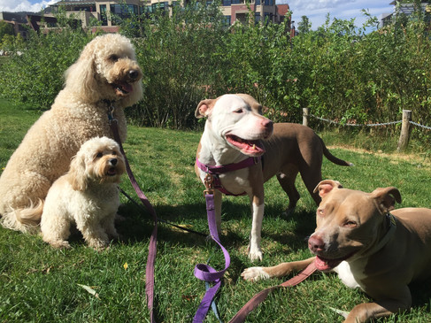Zoey, Carl, Lou, and Rey all got their paws wet in some shallow water in Boulder Creek. Nobody lay down or splashed around at all, and they all returned to dry land pretty quickly. We didn't make many other stops along the way, and the dogs all walked in place and on pace. Rey was quick to lie down when we stopped for a photo in Central Park. Lou kept trying to creep up to me, and I kept directing her back among the others. Carl and Zoey sat patiently until we were ready to get moving again.