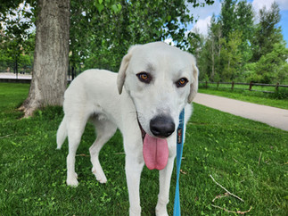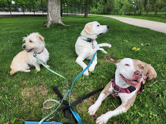 We had two new pack members today: Buddy and Alfie! Buddy is a fun and lively little terrier. Alfie is a sweet Great Pyrenese with exceptional leash-walking manners. They joined Lou, who was eager to sniff out her new friends; and they, in turn, were happy to meet her. Alfie was especially interested in meeting Buddy, who was super outgoing at first greeting but then shied away a bit as big Alfie kept following him around and nosing him. We walked the Bear Creek Greenway this afternoon. An old hound dog waddled over to us in Martin Park at the start of our walk. Everyone happily greeted, and then Buddy started barking out his excitement while Alfie and Lou continued to sniff. Alfie showed impressive poise by stopping and sitting in place whenever I stopped to address Buddy, who was having some difficulty keeping together with the pack rather than trying to bound ahead. Buddy also made his best effort to trip Alfie up and get his leash wrapped around his legs, and Alfie was very patient as I stopped to untangle them. Everyone's attention magically got onto the same page whenever I reached for my treat pouch. With some more practice, I'm sure Buddy will start to adjust to the rhythm of the pack and Alfie won't have to be so careful of the tripping hazard. Lou followed a step behind the rest of us throughout the walk, helping to make it a bit easier for me to handle the two new additions.
