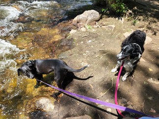 It sure was hot today! Avo was eager to get into the water, but showed some restraint when she stayed at my side as we approached the creek. Once we got close enough, that went out the window and she bolted into the water. She and Sputnik both ventured out into a deeper pocket where they could do a little paddling. Griff went in chest-deep, but didn't swim. Ruffers hung around at the edge of the water most of the time, and only stepped in for a quick dip just before we headed on.