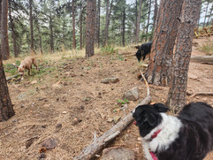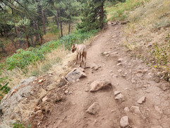 Rey rushed ahead when she went off-leash on our Chautauqua hike today. Meanwhile, Bear lingered further behind. He and Ruffers were taking their time poking along the trail and backtracking to investigate scents we had already passed. Every so often, Bear would go catch up to Rey in the lead. We practiced recall when other hikers came along the trail, and everyone was happy to munch on some treats. Rey got excited about something down in the brush-filled ravine by the junction of the Bluebell Baird and Chautauqua trails. There was a big pile of bear scat a short way down Chautauqua Trail, right by where Rey and her packmates had gotten worked up last Thursday, confirming my suspicions.