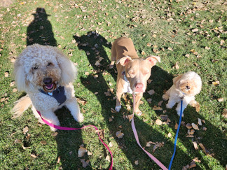 Zoey and Lou hovered over Avo while Avo wiggled on her back in the grass by the basketball courts, during our usual stop along the Bear Creek Greenway. Meanwhile, Rey was nibbling on twigs and Carl was tearing up little tufts of grass and trying to eat the dirt/roots beneath them - a habit he seems to have picked up from his big sister, as I've often seen Zoey do the same. There were a lot of leaves around, but no wind; As much as Carl likes to chase down leaves, he has no interest when they are inanimate.