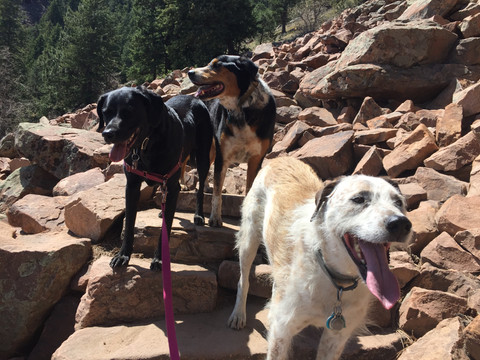 Racer nibbled on some grass early on in today's hike. I was nervous that she might have an upset stomach again, but she did fine. Everybody drank some water - even Griff; although he was satisfied with far less than his thirsty packmates. Racer, Sputnik, and Griff all did a good job navigating the irregular stone steps up the slope of the Flatirons Trail. Racer off-roaded it at one point, scrambling up some less inviting rocks alongside the main route.