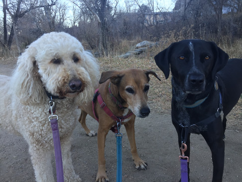 Avo was in a bit of a reactive mood this afternoon. It started with barking at some deer in Mamacita's neighborhood, when we headed there to pick her up. On the walk, Avo was disturbed by a recumbent bicycle, and barked quite a bit even as I directed her off the side of the Boulder Creek Path. On the way home, she barked from the car at some dogs she saw walking down the street nearby. She also tried mounting Zoey quite a few times today. Meanwhile, Zoey and Mamacita provided an alternative example for their packmate, by being their usual relaxed selves.
