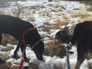 Sputnik poked along the trail and munched on snow here and there. Racer joined him to sniff around a eat a little snow as well. Griff and Carl were happy to scout ahead together and greet dogs when they passed by. With the wind tamed, the sun out, and a temperature in the low 50's F, it was beautiful weather for hiking.
