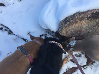 Mamacita, Riley, and Rey headed to the Bear Creek Greenway this afternoon. I was surprised to see Rey react poorly to the couple dogs we passed during our walk. Usually, Rey just trots along, but today she was very focused on the dogs we approached, and she growled as we went by. Riley was also pretty focused on the other dogs, and tried to make moves towards them as we passed, but responded quickly when I drew her attention away. Mamacita, on the other hand, was totally disinterested in the dogs we passed. She just wanted to trot along, and stop to sniff every so often. There was one boulder that the whole pack spent some time checking out. I noticed a bit of yellow in the snow, so it was easy to identify why the spot was so interesting.