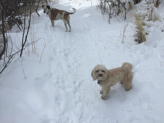 The Chautauqua was pretty empty today as Griff, Carl, Racer, and Sputnik trekked the snow-covered trails. In between long, quiet stretches, we did come across a couple other dogs. Griff and Carl were very excited to say hello to the first dog, who was an equally excited Doodle. Racer and Sputnik were happy to sniff the trail and munch on snow while their packmates socialized.