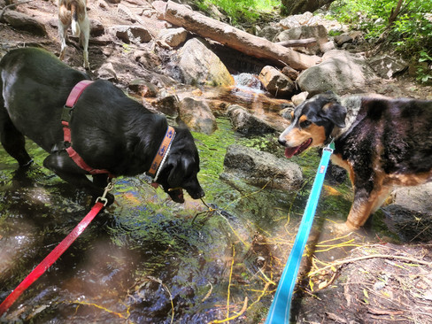 The pack was happy to get into the creek after taking their time picking along the Baseline Trail on the way toward Gregory Canyon. Griff and Carl went down into the muckier waters, while Racer and Sputnik stuck to the clearer water where we crossed. Racer scrambled around, dunking her face in the water and pulling up sticks. Sputnik just took a drink and hung out until we moved along.