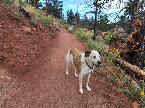 Racer was first in Farmers Ditch, eager to splash around in the water. Sputnik didn't wait to get in like before, and instead followed right behind Racer. Griff wandered off as we ascended to the red rock formation, and didn't return for a couple minutes. I wonder what had drawn his interest enough to ignore me calling him back to the group. Carl lingered far behind a couple times on our way back down, as he was sniffing and nibbling grass.