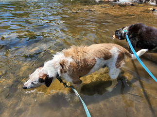 Racer eyed a lone goose intently as we walked by the Kids' Fishing Pond where it was swimming today. She got a little more worked up when it was standing near the path on our return leg. Carl ventured into deeper water than usual when we stopped at the creek, and got his underside well soaked. Griff followed Racer's example and scooped water up with his mouth hanging open. Sputnik took a drink in the traditional manner, lapping it up with his tongue.