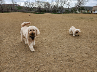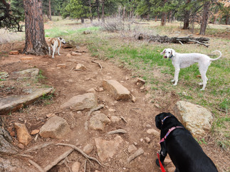 Imogene ran all around at the Chautauqua today. Griff joined in to run around with her some, but she also just frolicked on her own. Racer, Griff and Imogene all enjoyed greeting a very friendly Husky who seemed like she wanted to join the pack. Everyone nibbled at the grass in the same area the packs have been drawn to lately.