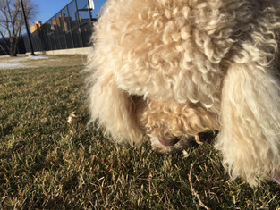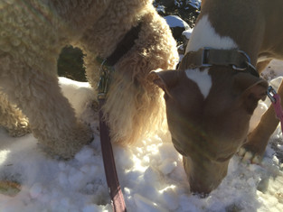 Mamacita, Avo, and Rey all enjoyed munching on some snow today. Zoey just wanted to sniff around in it, not eat it. We stopped in a field along the Bear Creek Path, where Mamacita enjoyed a good roll in the grass. Meanwhile, Rey, Avo, and Zoey were all chomping up some twigs from a small, fallen branch.
