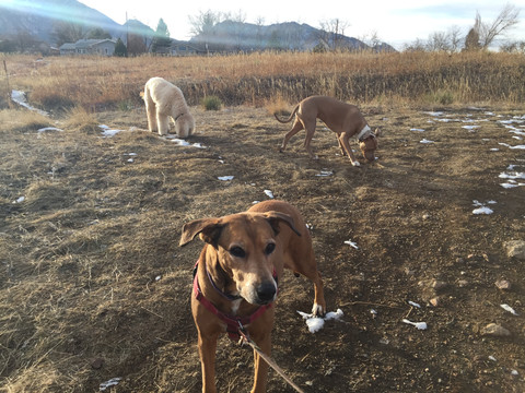Ruffers joined Griff, Sputnik, and Racer on the trails at CU South this morning. Sputnik and Griff both spent part of the hike off-leash with her. Unfortunately, Griff was tempted by a pile of poop - something he usually is not drawn to - and then spent the remainder of his time leashed up. Ruffers was very happy to greet each dog we passed, and to make playful moves with anyone who was game. Griff and Racer got to meet the pack's new Vizsla friend from yesterday. Everyone again sniffed hello in a very friendly and polite manner.