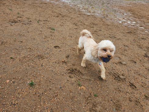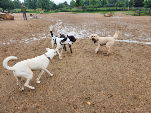 Zoey and Carl were happy to splash around in the puddles at Valmont Dog Park this afternoon. Zoey occasionally beat Carl to the tennis ball he was fetching. Then, she would often wander into a big puddle near the center of the park and Carl would jump at her to try to convince her to drop the ball for him. Sometimes this worked, other times Zoey kept hold of the ball for a while as she sniffed hello with other dogs and got pets from humans who didn't mind getting wet.