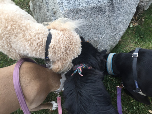 Rey, Zoey, Riley, and Avo all rushed over to the boulder that marks the Bear Creek Greenway at the field beside the basketball courts, and sniffed out the community forum there. Afterwards, all four of them perused and sampled the various twigs to be found beneath the nearby tree. On the return trip, Avo walked on her hind legs for several paces as we passed by a squirrel in a tree. I acknowledged the squirrel and she seemed satisfied, then resumed walking normally.