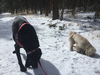 Racer and Carl were very interested in the scents to be found along one particular stretch of the Mesa Trail. They milled around with their noses down for several minutes as Sputnik munched on snow and Griff scouted ahead. Carl got very muddy again, with some fresh snowfall contributing to the supply of mud puddles on the trails. The others were pretty easy to clean up, but Carl is like a mop and his coat just hold everything in.