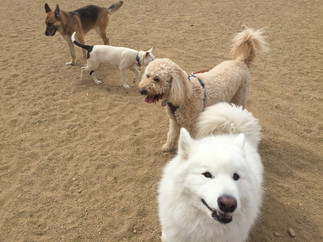 Zoey was very happy to find an extra large Chuckit! ball at the park today, and enjoyed playing fetch with it. There were a few other dogs about the same size as little Zoe, and she was happy to hang out with them. One white puppy with a black tail hopped around her to try to get her to play, but he was just a little too much so she gave him the cold shoulder. Petie befriended a Samoyed who also ended up being a little pushy. Petie tried out a few playful hops here and there, but seemed a little overwhelmed by the Samoyed's focused attention. Mamacita slowly roamed the park and sniffed the dogs who came over to see her, and then headed back to the gate to let us know it was time to leave.