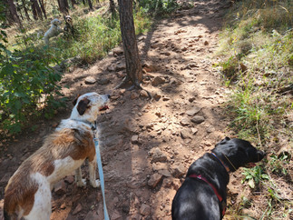 Archie and Imogene had a fun time frolicking off leash together at the Chautauqua today while Griff and Racer hiked along with me. At one point, Archie and Imogene ran far up ahead and it took a minute before I saw them racing back to us. Griff enjoyed some more mellow exploring while he was off leash later, and sniffed hello with a dog we passed as we started our way back down on Chautauqua Trail. Imogene chomped some sticks up into bits.