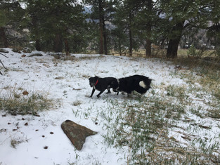 Dylan and Sputnik were both a bit touchy at the start of our hike, and responded to a passing Husky with growls when he started to approach us at the trailhead. A short while later, Dylan found his manners again when he greeted a Golden Retriever alongside Ruffers, and Sputnik also kept his cool as he walked by at my side. After that, Ruffers hopped around Dylan until he obliged her playful advances by racing a short way up the trail with her. Sputnik got a dollop of snow on his nose from sniffing around.