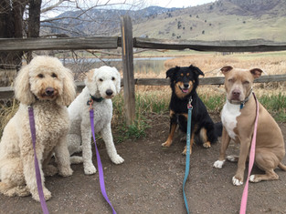 Riley was a little wary about Imogene before our walk today, since they usually come out on different days and don't know each other yet; so I sat in the back of the packmobile with them and doled out treats for a little while to facilitate the greeting before we gathered up Rey and headed to Wonderland Lake for our pack walk. Zoey was already with us, and she just took it easy while her packmates were getting acquainted. On the walk, Zoey was more go-with-the-flow than usual, not insisting on many stops along the way. Rey was our most curious sniffer today, veering off from the path at various points to check out scents of interest, with Riley following up close at her heels.