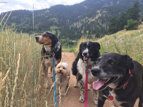 Sputnik seemed back to a normal energy level for today's hike. Carl and Dylan led the way up to the Farmer's Ditch. Some OSMP volunteers were amused at Dylan's way of lying down in relatively deep water to get his whole body soaked. Sputnik and Ruffers were on leash with me, but followed their packmates into the water once we caught up. A short while later, Carl was distracted by some squawking magpies, and kept going back and forth between a couple trees, to keep tabs on them. Dylan lingered behind at the fork momentarily, but then headed up the mountain with me, Ruffers, and Sputnik. Once it was clear that Carl was too distracted to heed my call, I went back down to the fork to get his attention. He finally snapped out of it and then came bounding up the trail back to the pack.
