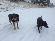 Imogene and Riley were pulling ahead pretty consistently during our walk on the snowy Boulder Creek Path this afternoon, so I began testing them by stopping in place. After a few repetitions, Imogene circled around and started walking behind me instead of trying to lead the way. Riley did not react as decidedly as Imogene, but she started looking at me more and slowing to a stop with me before the leash got tight. Zoey and Carl were doing a good job throughout. I thought the falling snow might distract Zoey from her routine stops, but she still made sure we checked out her favorite points around Eben G. Fine Park.