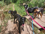 Archie and Kona were pretty playful with each other upon meeting this afternoon; however, Archie kept getting overly enthusiastic and jumping straight at Kona's face, which earned him a single, stern bark each time. On the walk, Kona gave Archie the cold shoulder when Archie kept trying to jump on her, and then she moved to my opposite side to get a little distance. Archie settled down after that, and the rest of the walk went pretty smoothly except when Kona slipped out of her collar. She stayed nearby but was hesitant to approach the pack because Archie kept getting excited and trying to jump at her each time she got close. I eventually got Archie to sit and wait politely along with the rest of the pack, and then I got Kona back, with her collar adjusted to not be so loose. Zoey, Imogene, Carl, Lou, and Racer were all pretty easy and accommodating as I handled the situation.