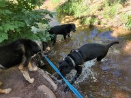 Dylan and Avo both made a couple stops to lie in the grass at Eben G. Fine Park before we got to The Peoples' Crossing. Once we were on the mountain, they both went up ahead to get to the stream as soon as possible. A couple passing joggers laughed at Avo's exuberance in bounding in and out of the water. Ruffers and Sputnik were more steady in the heat. They didn't call for any stops on the way, and they took their time getting into the water. But once they were in, they lingered there for a longer time than their packmates. We didn't go all the way up the mountain today, and instead spent the latter part of the outing walking along the shaded Boulder Creek Path. There were no geese around this morning, and the pavement seemed pretty well cleared of their droppings.